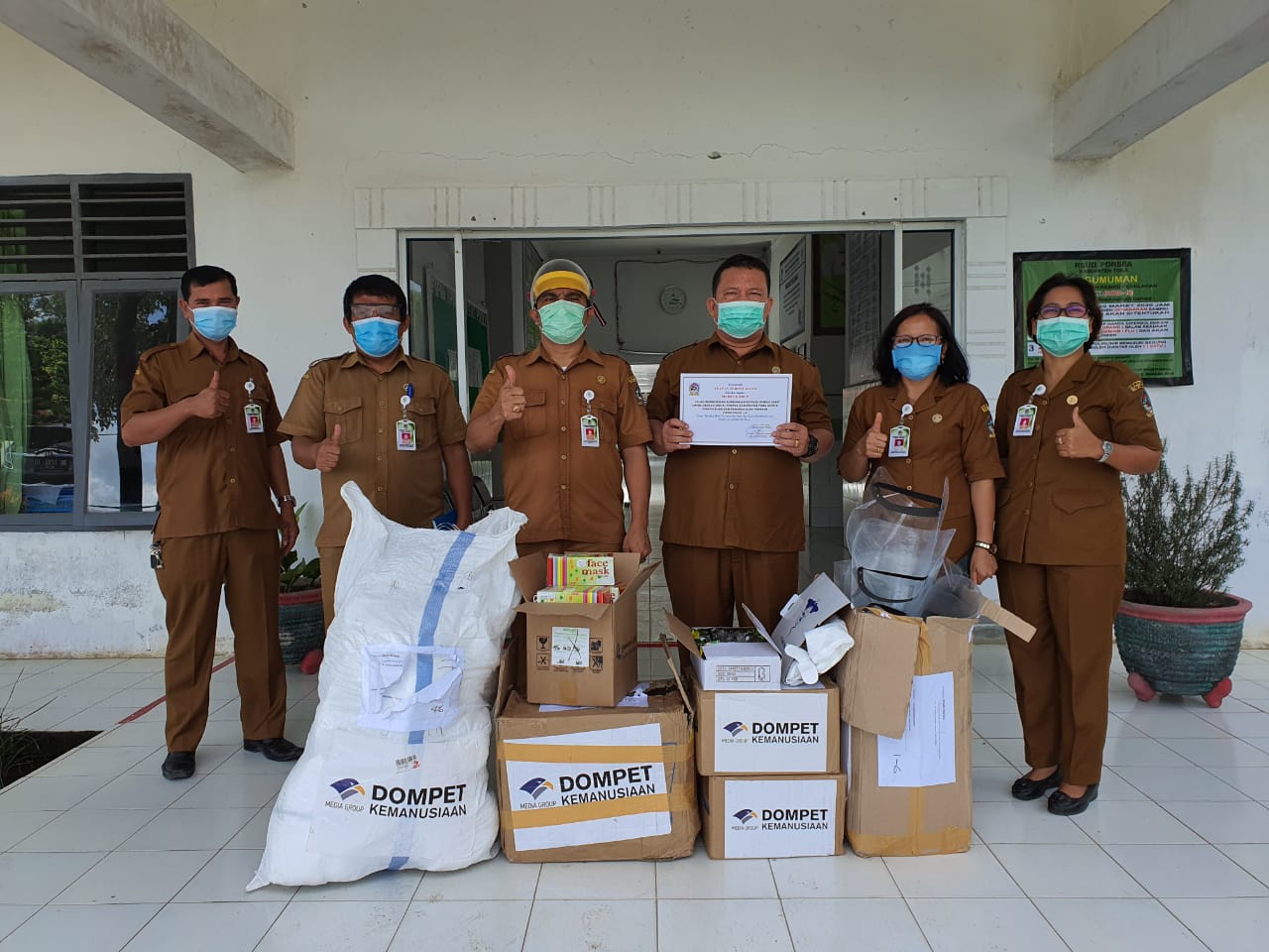 Paket bantuan APD untuk RSUD Porsea, Toba, seperti hazmat, apron plastik, gloves, masker, dan beberapa APD.